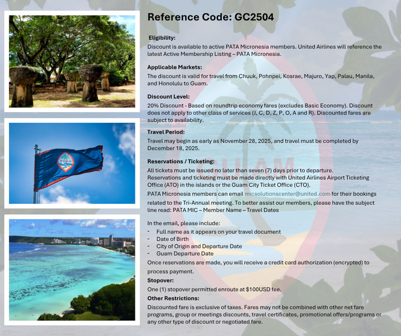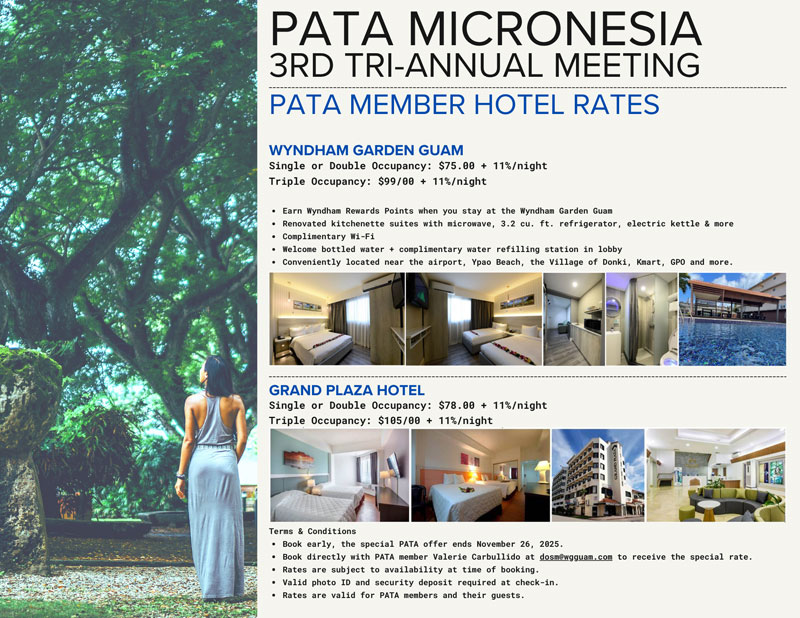 Mark your calendar for the PATA MICRONESIA CHAPTER 3rd TRI-ANNUAL meeting in Guam from December 8-10, 2025. Join us for meaningful discussions, networking, and collaboration within the PATA Micronesia Chapter. Your insights and active participation are vital to driving our initiatives and strengthening our community.