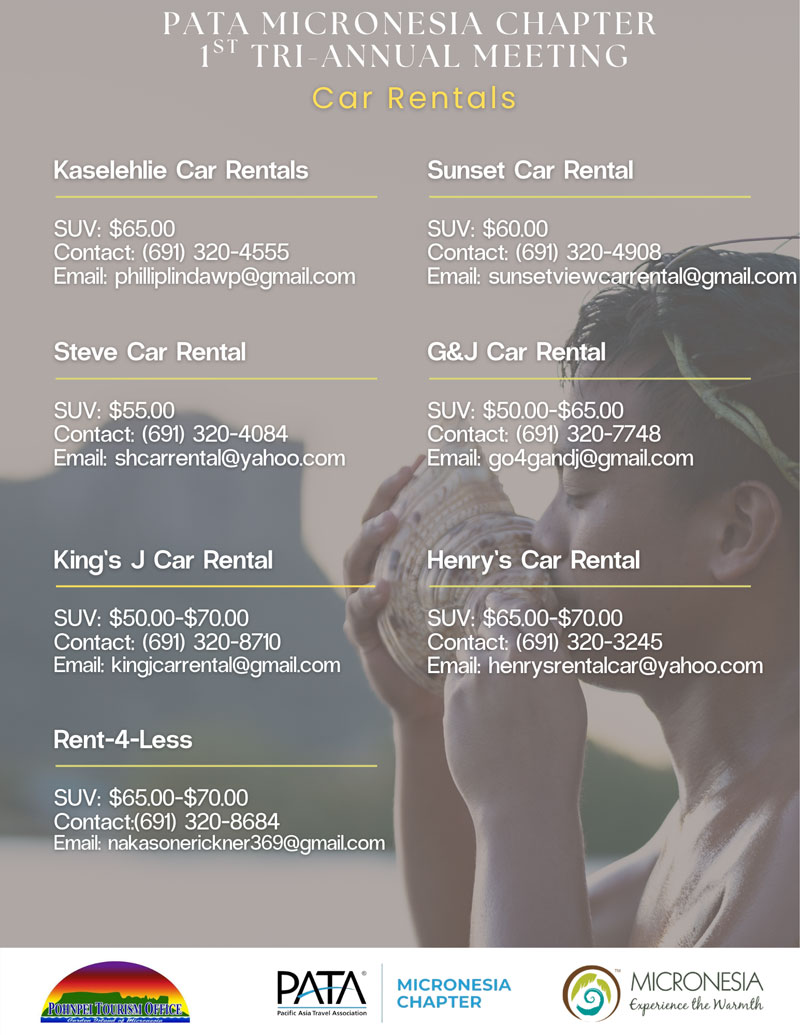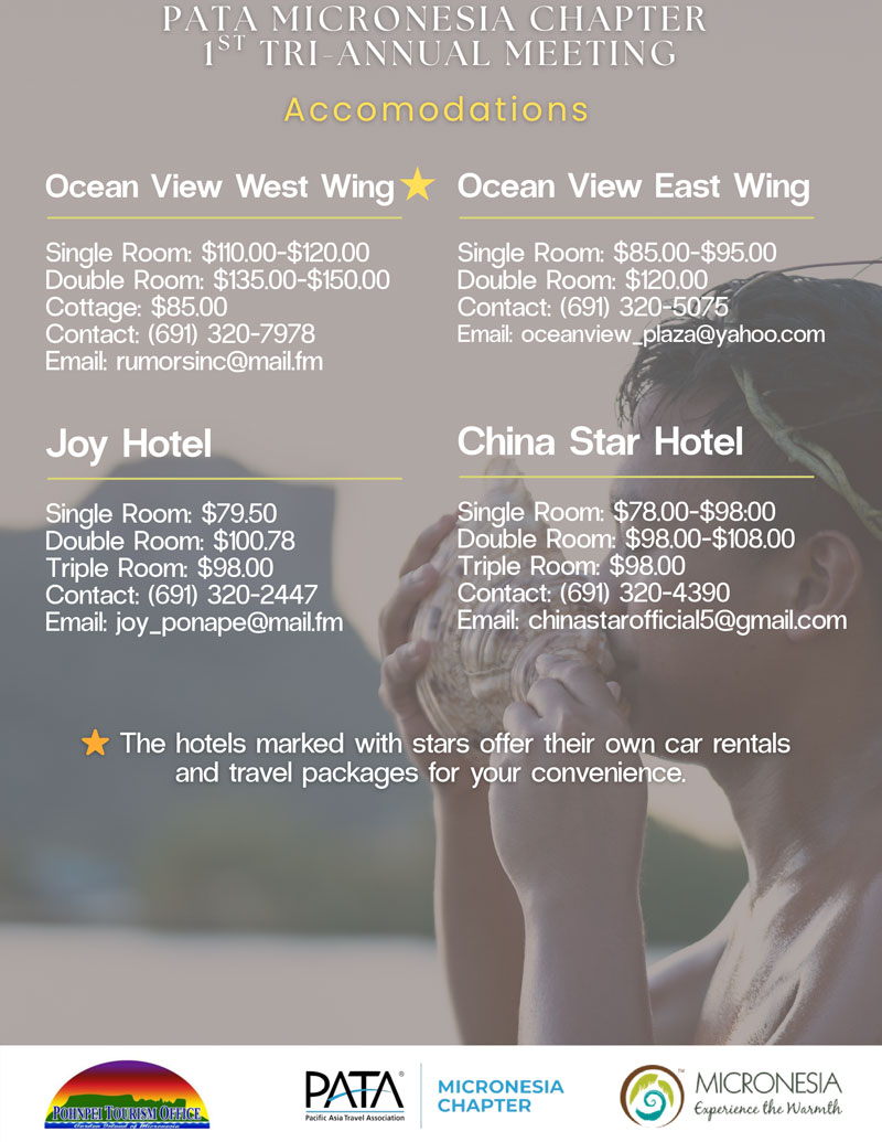The following discounted rates are offered to participants of the Pacific Asia Travel Association Micronesia Chapter membership meeting in Pohnpei. Participants must present registration / email as verification of participant's training.