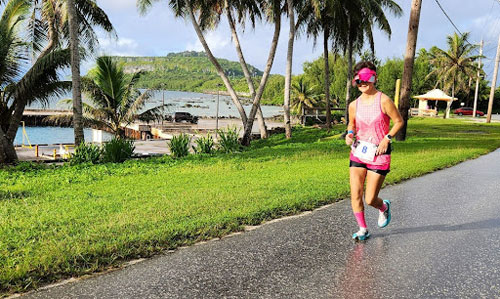 Solly Takai of the Marianas passes Sasanhaya Bay Fish Preserve as she finishes her 3:26:34 course at Rota Marathon 2026 on Jan. 31, 2026, in the Marianas.