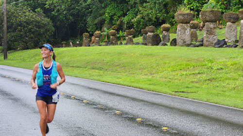 Krista Hawley of the Marianas passes ancient Chamorro latte stone monoliths on her way to a 1st place full marathon finish in the Rota Marathon 2026 Women’s Division on Jan. 31, 2026, in the Marianas.