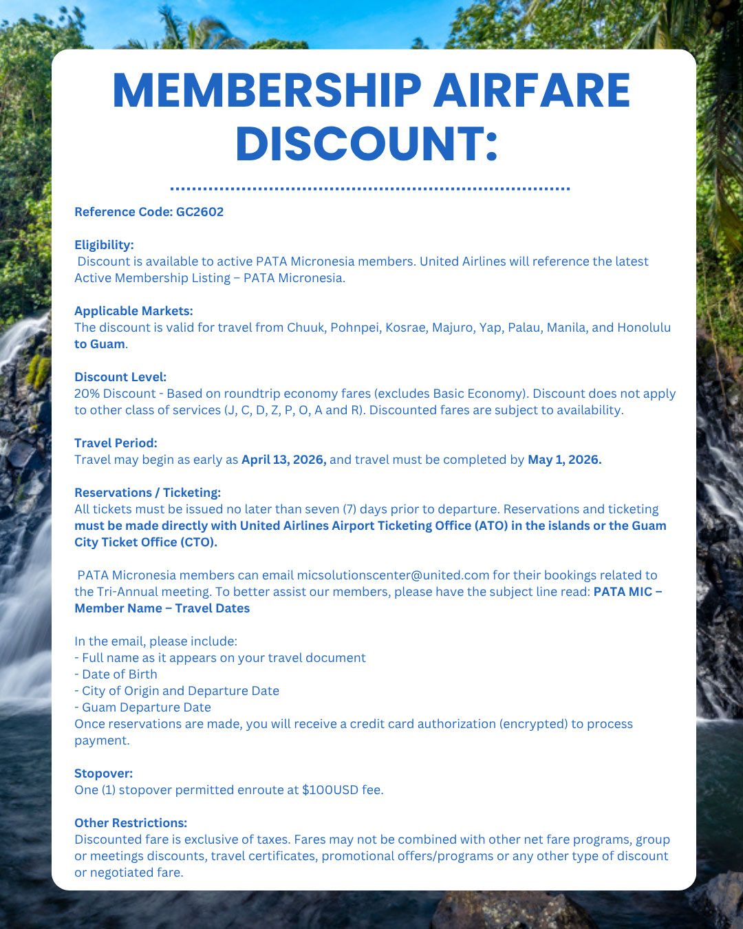 We are pleased to officially announce the new dates for the PATA Micronesia Chapter 1st Tri-Annual Meeting, which will be held in beautiful Pohnpei, Federated States of Micronesia, from: