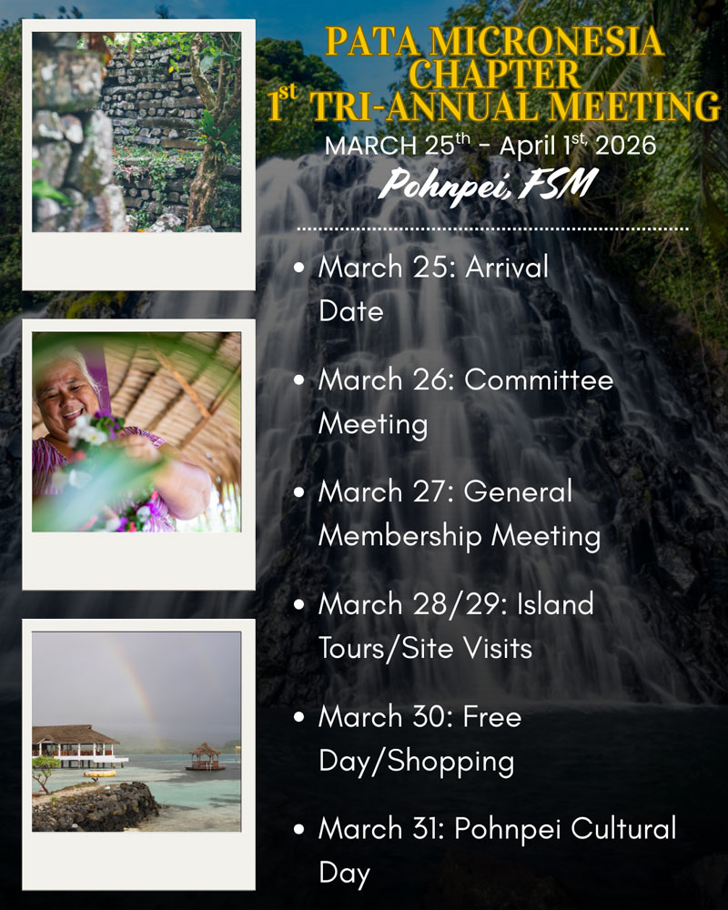 We are pleased to officially announce and invite you to the PATA Micronesia Chapter 1st Tri-Annual Meeting, which will be held in beautiful Pohnpei, Federated States of Micronesia, from:
