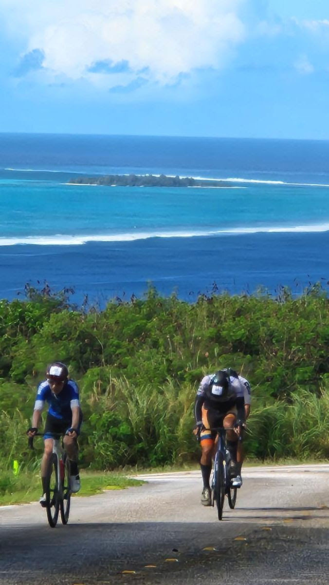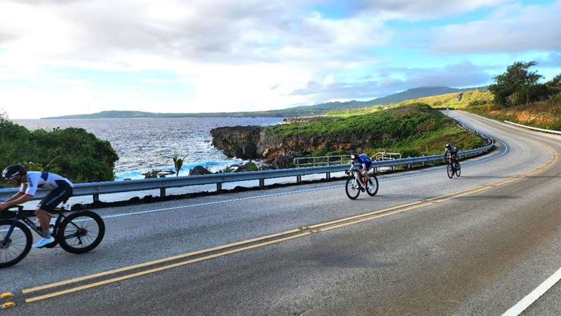 Unai Nanasu beach and the silhouette of Saipan frame bikers in the Hell of the Marianas 2025 Long Course on Dec. 6, 2025, on the island of Saipan. The century cycle attracted 110 registrants from 8 countries and territories.