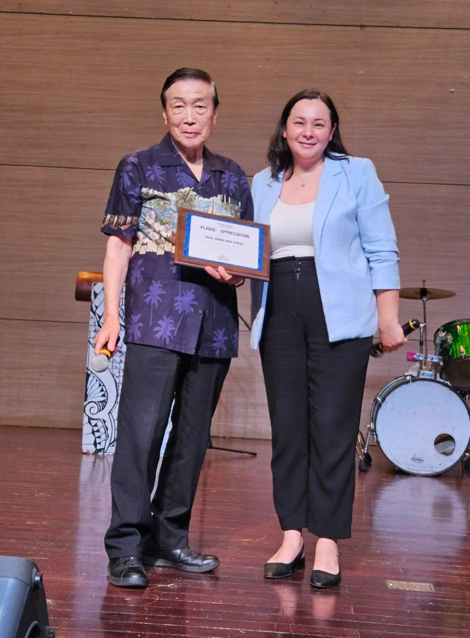 Marianas Visitors Authority Managing Director Jamika R. Taijeron, right, presents a plaque of appreciation to Hajime Kaneko, Chairman of Seisa Group, at a welcome dinner for Seisa Junior High School on Dec. 1, 2025, at Saipan World Resort in Saipan, Marianas.