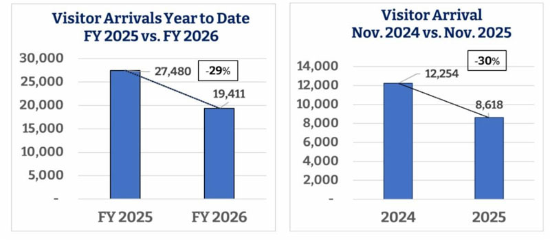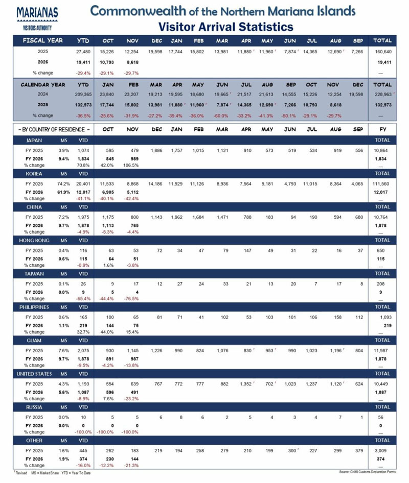 Saipan, Northern Mariana Islands — The Marianas Visitors Authority (MVA) reports that visitor arrivals to the Marianas totaled 8,618 in November 2025, a 30% decrease compared to 12,254 visitors in November 2024.